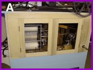 PHOTO B shows another view of the completed doors. In the instance of the Wurlitzer 105 organ, the crankshaft is located above the shelf on which the roll frame is mounted. In the larger Wurlitzer organs, the crankshaft is located below the shelf which holds the roll frame and the crankshaft extends through a hole in the center board. In the case of the 105, the crankshaft extends through the side of the upper frame. Usually an adjustable wooden bearing is mounted on the inside of this board to support the crankshaft where it goes through this board. I will use a surface mount pillow block on the outside of the upper frame.