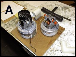We used two vacuum motor pumps. One has a captured exhaust which allows it to supply wind pressure. PHOTO A shows these two motors positioned on a mounting board. This allows us to see what size box will be required to house the motors. The larger motor is the one used to supply the wind.