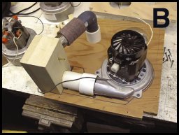 PHOTO B shows the wind motor positioned on the board. It was necessary to route out a space on the board to enable the motor to be mounted on the board. (This space can be seen on PHOTO C.) The large solid block of wood on the left of PHOTO B serves as an inlet and outlet junction for the vacuum and wind. The large hose and angle visible on the top of the photo serves to connect to the vacuum motor which will be mounted on the other side of the board. The small nipple on the wood block will be connected to a vacuum gauge.