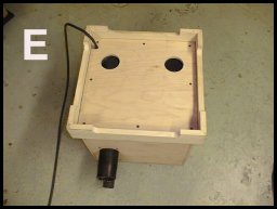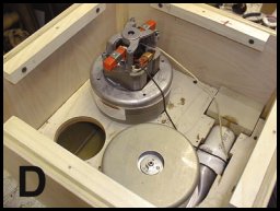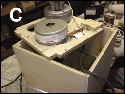 PHOTO C shows the motors mounted on the board and the box enclosure constructed out of plywood with corner cleats to support the sides. The center board with the motors will be positioned in the center of the box.