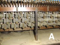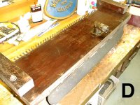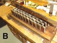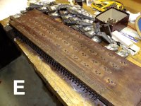 In PHOTO E we have removed all the valve units from the stack along with the wood strip which holds the screws for the access to the bleed cups. The bleed cups are visible along the lower edge of the stack face.