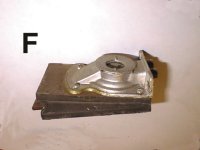 PHOTO F shows a close up view of the combination valve and pneumatic unit. This is one of the interesting features of the Tangley. The valve and the pneumatic is combined in one unit. This allows removal of a failed valve or pneumatic easily by just removing two mounting screws. You donšt need to pull the entire stack to get at a bad pneumatic. The valve assembly is made from pot metal and tends to be fragile. The pneumatic is fastened to the pot metal valve assembly with four screws. Extreme care must be used when working with them to prevent breakage. These are impossible to find if you happen to need a replacement. Another interesting feature is the ability to access the bleeds for the valves with the simple removal of a screw. Each bleed cup is accessed with its own screw. No need to remove the stack or the valve assembly to get at the bleed to remove a clog.