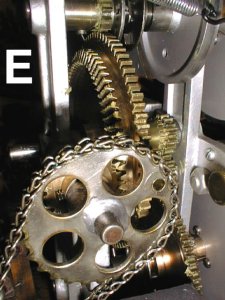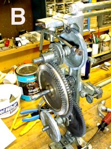 In PHOTO E, the other parts of the frame including the gears have been cleaned, some painted with the silver finish and others just with a clear finish. The entire frame was reassembled along with the supply and take up spools so that the operation of the frame could be checked.