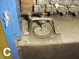 PHOTO C shows the pressure relief valve located on top of the pressure reservoir. This valve is located on the keyboard side of the machine. There is a lever which extends through the side of the case which allows the operator to open this valve in order to spill off pressure and take some of the strain off of the blower when the calliope is not being played. The valve is spring loaded and when the pressure reaches a certain value, the pressure pushes the valve open to spill off excess pressure.
