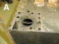 In PHOTO A we can see the top of the pressure tank where we have removed the pressure spill valve. This base of the valve has a steel plate with nuts and bolts to attach it to the tank. Several of these bolts have the threads stripped. The bolts are soldered to the top of the tank and you need to unsolder them to replace the stripped bolts.