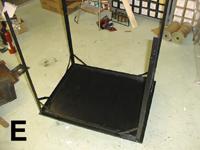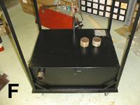 In PHOTO F, the tank has been mounted in the frame by means of the wooden wedge arrangement described previously. I also made a wooden base with casters to hold the machine so it could be easily moved around as we work on it.