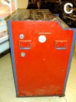 PHOTO C shows the left side of the machine. Handles are mounted for grips to move it around. Also included is a pressure gauge to monitor the pressure on the pressure tank. Everything is designed to use all the internal space in the cabinet and the roll frame is so close to the side of the machine, they needed to use two holes in the side of the cabinet for the axle on the music roll spools to be moved thru the side of thecabinet a bit to remove the music roll spools.
