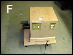 In PHOTO F, the completed unit is shown. It has switches to turn the vacuum or the wind motor on or off. If you want to play the calliope by hand, the vacuum motor does not need to be operating. Also visible is the electrical outlet and the vacuum gauge mounted on the top. We use a 110 volt light switch dimmer to regulate the speed of the vacuum motor and the vacuum level produced. The adjustment for the dimmer is accessed through a small hole in the side of the case. This is visible between the switches and the electrical outlet.
