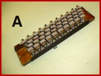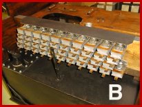 In PHOTO B we have installed the stack in the calliope. We use a strip of motor cloth tacked onto the top of the stack to act as a dust cover to protect the top facings on the stack valves from debris. The upright brace shown in the photo will act as a support for the center of the stack linkage which will be installed later.