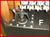 PHOTO F shows the relief valve installed on the tank. The disc with the leather facing is spring loaded. By adjusting a nut on the threaded stem, the pressure on the valve can be varied by the amount of compression on the spring. More spring pressure causes the wind pressure to spill off at a higher value. So, by means of the adjustment, the operating wind pressure of the calliope can be set.