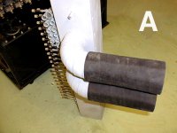 We are now ready to install the windchest. PHOTO A shows the windchest which we restored some months ago. The two large pressure inlets on the windchest are connected to the outlets on the pressure tank by two large hoses. These large hoses have a 3 inch diameter. The original ones were in bad shape so I needed to find new ones. I figured this would be a difficult item to find. We have a farm supply store here in my town which stocks radiator hoses for farm equipment and I thought this might be the best place to start the search. I took the old hose to the store and showed it to the parts man. Surprise..... this diameter hose happens to be a common size hose on old tractor cooling systems. He just happened to have about a 3 foot piece in stock. This hose was the exact same material and appearance as the original.
