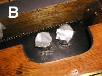 PHOTO F shows a closeup view of the mounting arrangement for the windchest. There are square cutout holes in the wooden sides of the case in which the windchest fits. These holes are large enough to allow the windchest to slide into position. Then, small wedges are inserted between the windchest and the case to secure the windchest in the hole. The main support for the windchest is provided by the windchest resting in these rectangular holes in the sides of the case. Two brackets on the ends of the windchest are fastened to a cleat which in turn is mounted to the side of the case. This maintains the position of the windchest in the case. Also visible in PHOTO F is another cleat which provides additional support for the handles on the outside of the case.