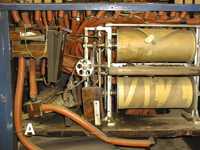 The cabinet is basically divided into 2 parts, the lower part of the cabinet housing the pressure reservoir tank and the upper part housing the roll frame, air motor, stack, windchest, hoses and associated control mechanisms. In PHOTO A, we have removed the back panel to expose the shelf which holds the roll frame and air motor. In the lower left part of the photo, you can see the air motor which runs from the vacuum supply. Considering the fact that this type of air motor is common to ordinary player pianos using a rather light weight roll frame, you might think that the rather heavy duty roll frame in the calliope would be asking a lot of the air motor. But, it works very well in this application.