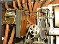 PHOTO E shows the rewind shifter mechanism. This mechanism servers to shift the roll frame from the play mode to the rewind mode and then back to the play mode after the rewind is completed. The mechanism is vacuum operated. This is what we can see from the back of the machine.