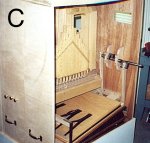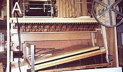 There are two nearly identical bellows sections which sit next to each other with the reservoir mounted on top. Each of the sections has a stationary top board and bottom board and a movable center board. The center board is moved up and down by means of a wooden rod connected to one of the lobes on the crankshaft. As the board moves it causes air to be drawn into one of the bellows chambers while at the same time air is being pushed out of the chamber on the other side of the center board.This air is pushed into the reservoir. Leather check valves keep the air from going back into the bellows when the center board starts moving in the other direction. As I said earlier, there is another almost identical unit sitting next to this one and its center board is connected to another lobe on the crankshaft which is 90 degrees rotated from the first one. This means that as the crankshaft rotates there is an almost constant air flow going into the reservoir. I say almost constant because there are still fluctuations in the flow. It is the job of the reservoir to even out these fluctuations and also set the pressure at the desired level. In PHOTO A one can see the pressure bellows at the bottom of the picture. The bottom board cannot be seen because it is below the white board which is part of the back of the cabinet. The movable center board is just above this white board and one can see the slot in the edge of it which is the air intake port. The flexible leather sides of the bellows are black cowhide. In this picture the crankshaft is not turning and so the reservoir is closed. The top of the reservoir is being held down by three large leaf springs. In PHOTO B one can see the reservoir in the full open position because the crankshaft is turning and air is being pumped into the reservoir. The top of the reservoir pushes against the three springs and the level of pressure is set by adjusting the amount of tension in the springs. In Photo A the spill valve can be seen sitting between the springs. When the top board of the reservoir reaches its maximum height the arm of the spill valve strikes the wooden bar causing the valve to uncover a hole in the top board and exhaust the excess air. PHOTO C shows another view of the bellows and reservoir. This photo shows more clearly the crankshaft and the wooden rods going to the bellows. The crankshaft is supported by the two large wooden bearings which can be seen in this picture. The rear of the cabinet itself serves as the third bearing for the crankshaft. In this picture that part of the cabinet has not yet been installed