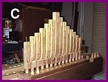 I mentioned earlier that this set of pipes gave me more problems that any of the others. The main problem was "overblowing" in that the pipe was not stable at its fundamental frequency but would break into a tone an octave higher. I finally solved this problem by making the wind hole in the foot of the pipe slightly smaller than called for in the plans. The completed set of flageolet pipes are shown mounted on the wind chest in FIGURE C.