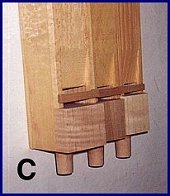 The larger, lower pitched pipes have a slightly different harmonic brake which is made of wood which is attached across the mouth of the pipe. PHOTO C shows the wooden harmonic brakes on the bass cello pipes for pitches C, E, and F. The photograph is a little misleading because all three pipes are butted up against each other and it looks as though the brake is one long piece. However, there is a separate brake for each of the pipes.
