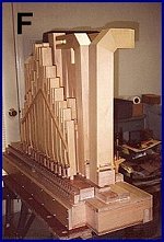 In the plans I used, the drawings which indicate the mitering of the bass cello pipes were somewhat confusing. I hope that the photographs I am showing here will help to clear up some of that confusion. In PHOTO D the pipe on the left is the C bass cello, the one in the center is the E bass cello, and the one on the right is the F bass cello. When mounted in the organ the mouths of these pipes face the rear of the organ. This is further illustrated in PHOTO E. This photograph also shows the melody violins on the right with their mouths facing the rear of the windchest and just to the left of that the accompaniment cellos can be seen. Also note the positions of the tuning slides. For the E pipe in the center the tuning slot will need to be in the back side of the pipe before mitering in order for it to end up in the position shown. For the C pipe the tuning slot will need to be in the right side of the pipe before mitering. I also found that the dimensions given for the spacing between holes for the pipe feet for these three pipes put the holes too close together to be able to fit the pipes in without interference between them and I had to remake the riser that these pipes fit into.