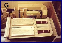 PHOTO F shows the G bass cello with its mouth pointed toward the left side of the organ. One can see in this picture that as the pipe rises from the windchest it is mitered toward the front of the organ and then in PHOTO G one can see how it is then mitered so that it extends across the top front of the organ. The D bass cello can be seen next to the G bass cello with its mitered top. The G bass cello will not fit into the case if the dimensions given in the plan are used. Fortunately I realized this before I mitered the pipe and was able to calculate the dimensions that would work. And finally, the windchest with its pipes in place is shown in PHOTO H.